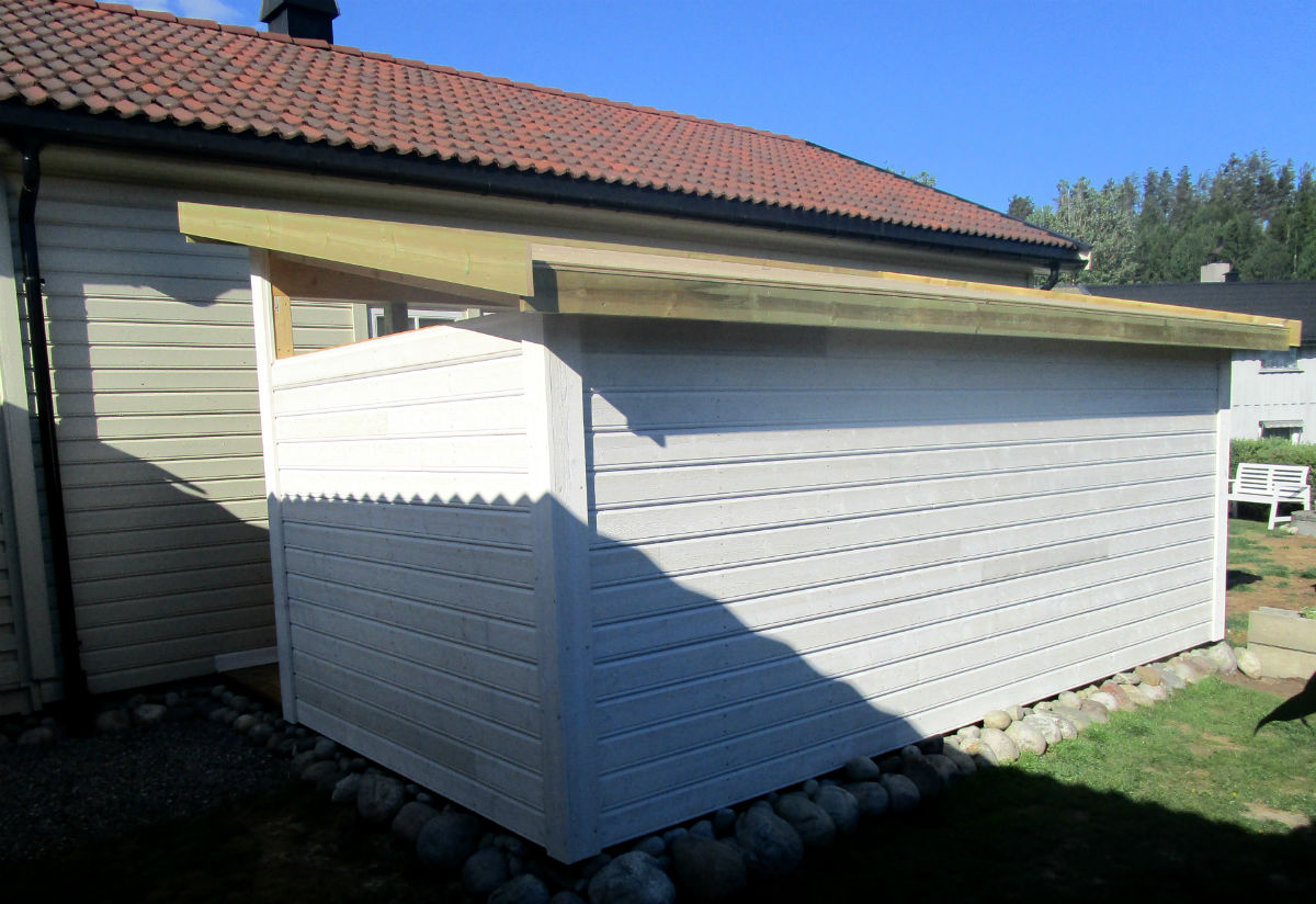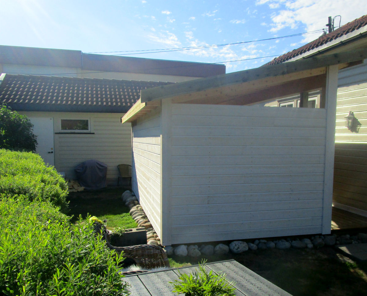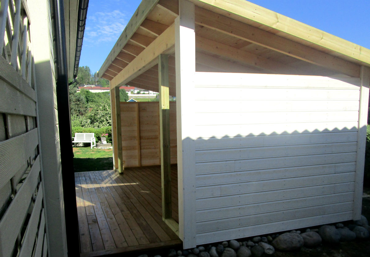 Bygging av takoverbygg på eksisterende terrasseplatting, med tak og vegger. Skråtak. Hvitmalt kledning. Trykk på et bilde for å se det i full størrelse.
